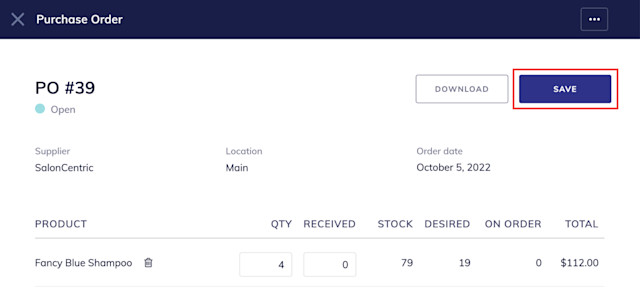 Use the Download button to download the purchase order as a PDF to send to your supplier or select Download as Excel from the "..." menu to download the purchase order as a CSV file.