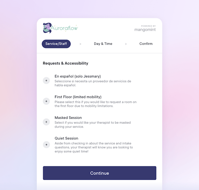 Mangomint's Service Customizations feature is best known for helping businesses offer add-ons and upgrades. However, this tool is also perfect for helping you create a more inclusive space. Auroraflow perfectly demonstrates this, offering booking options like: