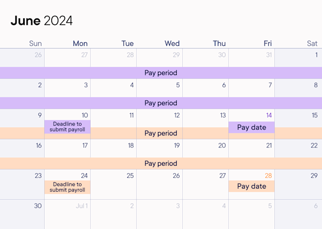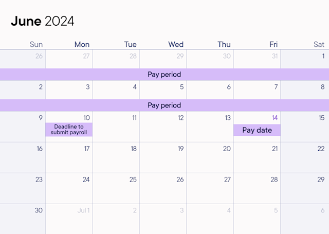 The worker will be paid on June 14 (pay date) for work performed May 26–June 8 (pay period). For direct deposit, your pay period must end at least 4 days before your pay date.
