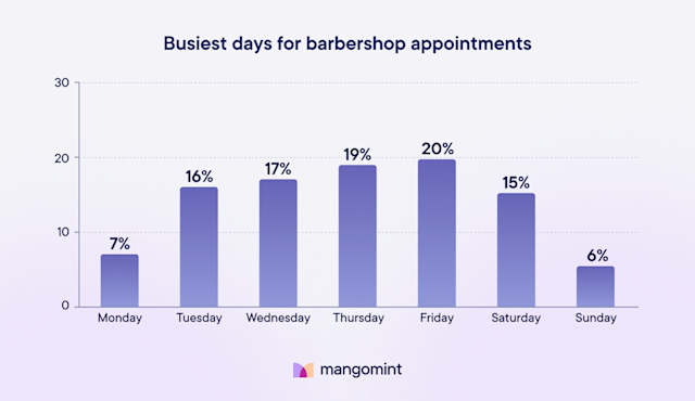 The end of the work week is the busiest time to be behind the chair in a barbershop, accounting for nearly 40% of all barbering appointments. This spike in appointments could come from clients preparing for their weekend plans or scheduling around barbershop closures.