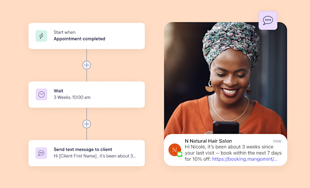 Using Mangomint’s marketing & automation tool, they’re also able to send automated rebooking reminders, pre-appointment instructions, and post-appointment follow up text messages without lifting a finger.