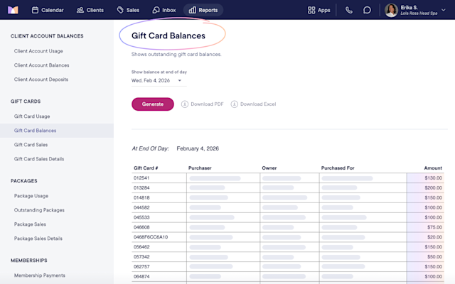 When Erika signed up for Mangomint, she transferred a lot of gift cards from her old system. Once she was up and running, her onboarding manager showed her how to pull the Gift Card Balances report.