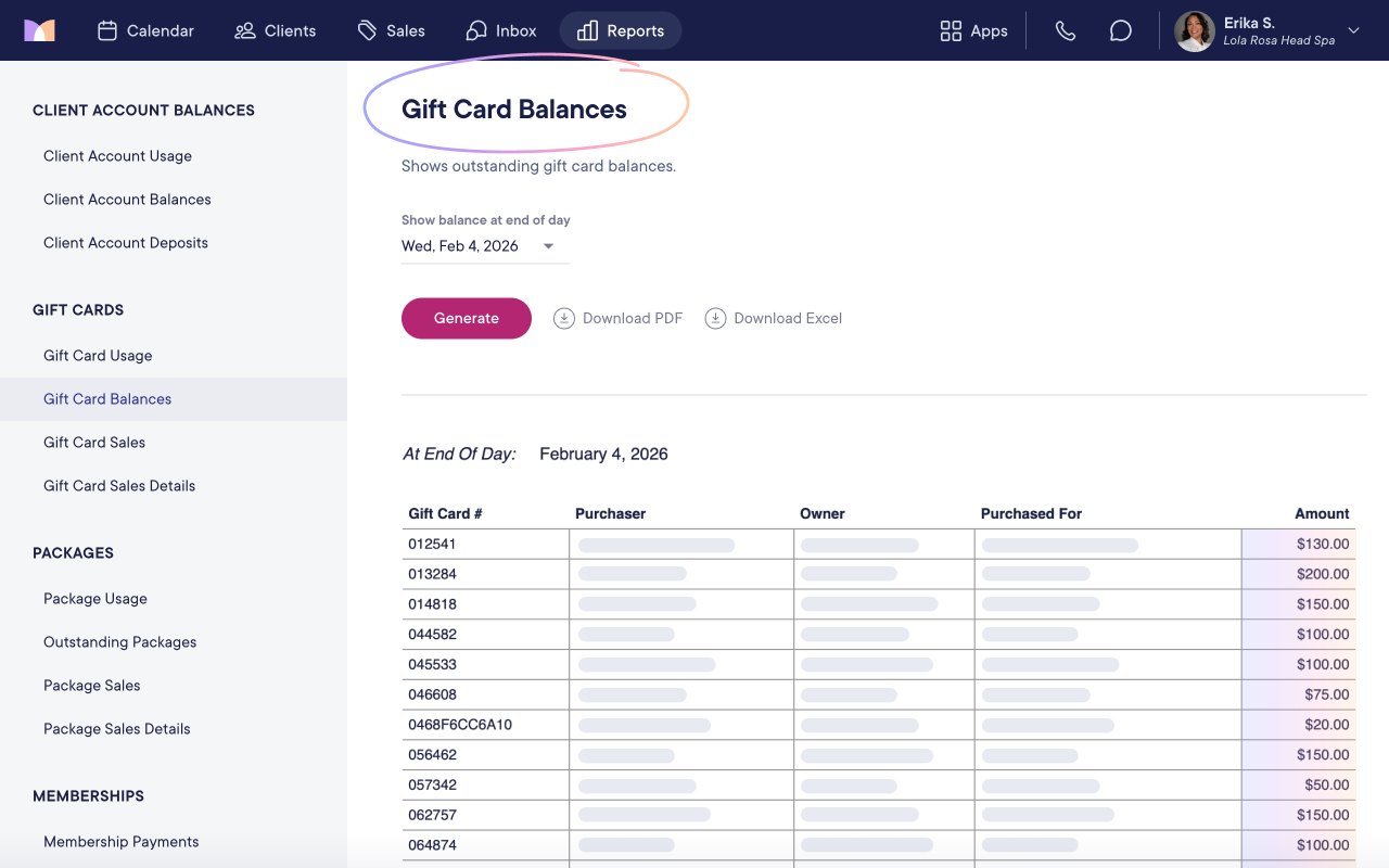 When Erika signed up for Mangomint, she transferred a lot of gift cards from her old system. Once she was up and running, her onboarding manager showed her how to pull the Gift Card Balances report.