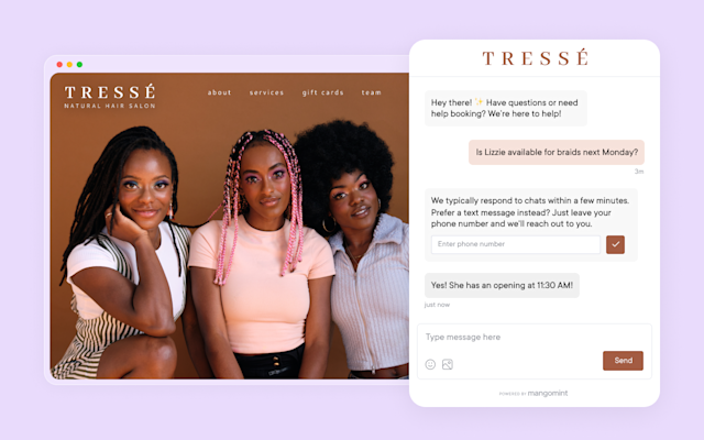 With Web Chat, you can connect with both prospective and existing clients by giving website visitors a convenient way to reach you. This makes it easy to engage with new clients, even when you're busy with appointments. If you’re unavailable, visitors can leave their phone number, so you can follow up with a quick text as soon as you're free.