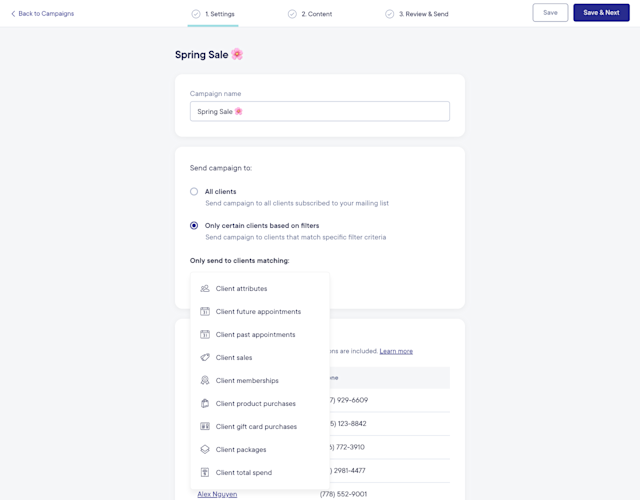 Service-specific campaigns such as re-engagement campaigns for all clients who received facials in the last two months, or clients who have gone over four months without a haircut appointment