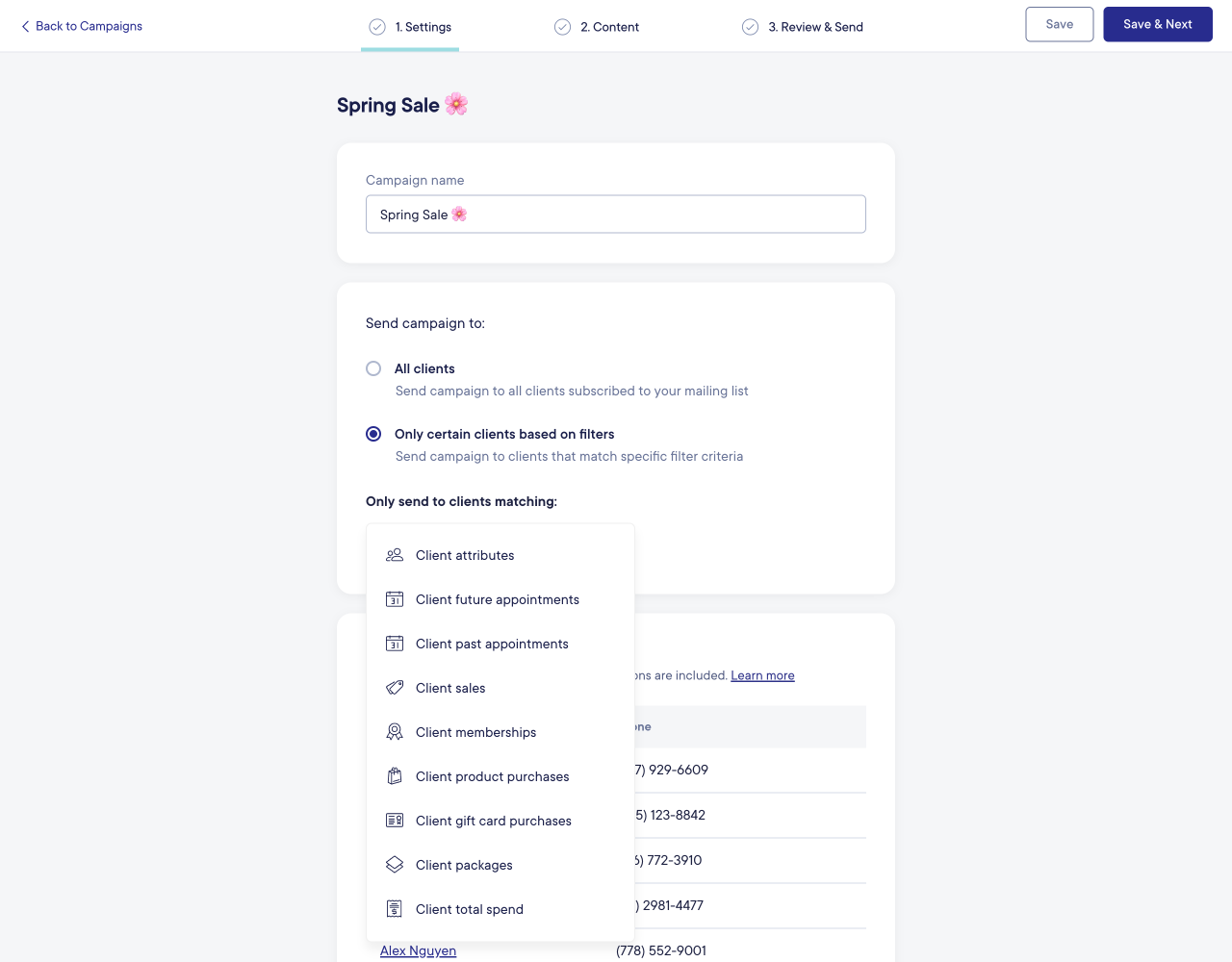 You can even combine multiple filters to create a highly specific audience for targeted campaigns. Or, if you have a broader campaign in mind, you can send a text blast to all clients eligible to receive your marketing texts.
