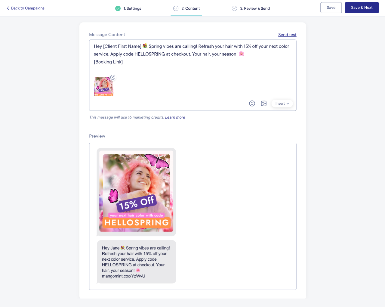 This feature uses a credits-based system so you can pay as you go. Marketing credits cost 1c each. Read this article to learn more about how marketing credits work. If you’re not using Mangomint yet, start a free 21-day trial or book a demo to see Text Campaigns in action.