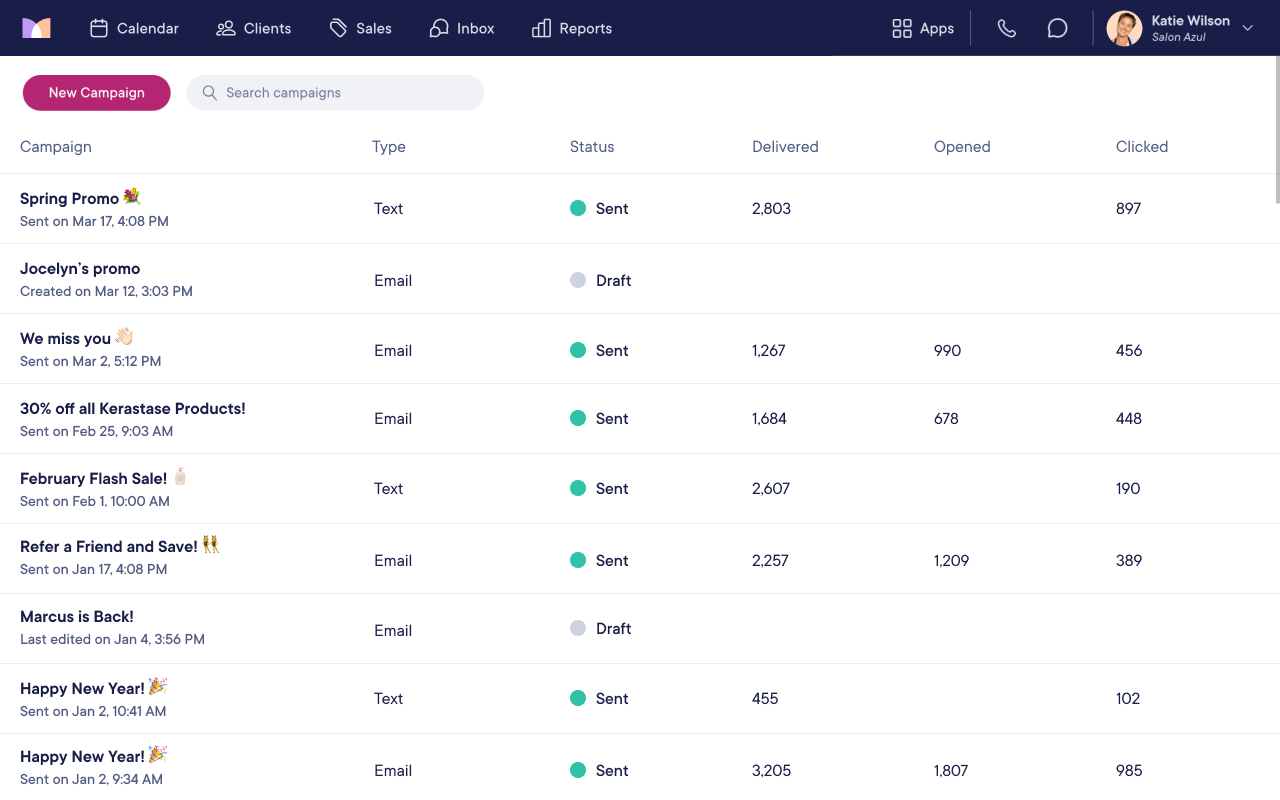 Service-specific campaigns such as re-engagement campaigns for all clients who received facials in the last two months, or clients who have gone over four months without a haircut appointment