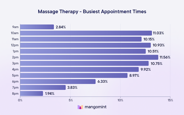 When creating your staff schedule, it is essential to plan around the expected appointment traffic. 2pm is the busiest time of day for massage therapy appointments, accounting for 11.56% of massage appointment start times.