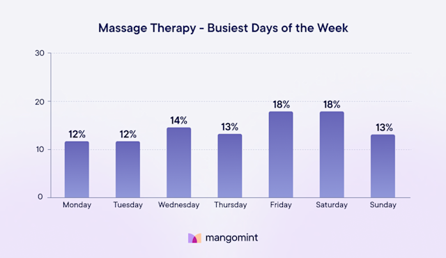 This pattern seems to reflect the massage therapy industry’s longer appointment durations and the goal of achieving restoration and relaxation, which might be hard for clients amid other mid-week obligations.