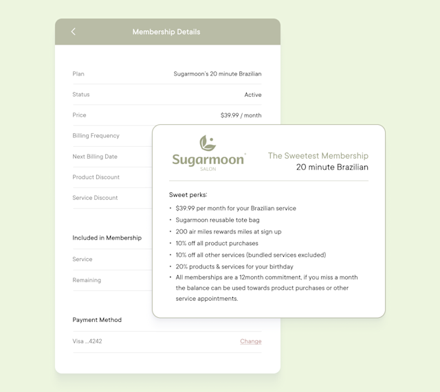 Memberships are a great way to build customer loyalty and create dependable, recurring revenue. Sugarmoon’s memberships offer monthly eyebrow services or a Brazilian at a discount along with perks like 10% off for additional services and products. It’s a win-win for the business and their clients.