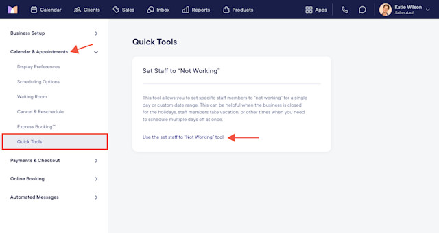 To set days off for multiple staff members, open the Settings app and select Calendar & Appointments > Quick Tools.