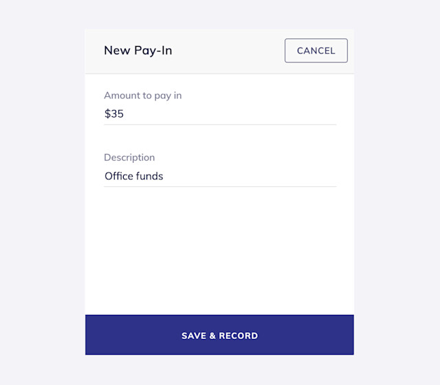 To add money to the cash drawer, open the Cash Drawer app and select New Pay-In.