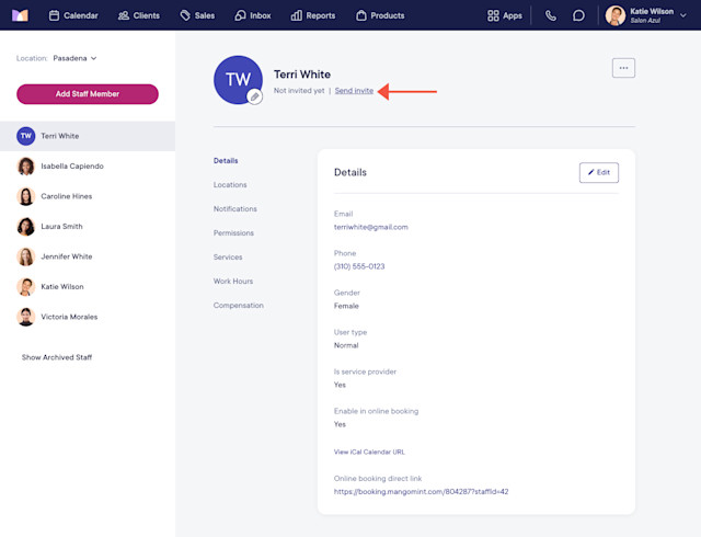 Once you select Create to create the staff member, you can select Send to send them an email invitation so they can create their Mangomint login. If you are still setting up your account, we recommend you don't invite staff members until your account setup is complete.