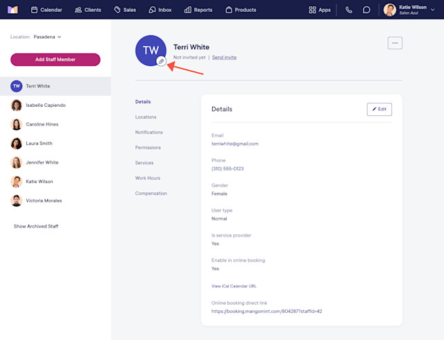 After creating a staff member, you can add their profile photo by selecting the pencil icon next to their avatar.