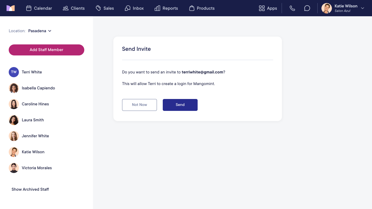 Once you select Create to create the staff member, you can select Send to send them an email invitation so they can create their Mangomint login. If you are still setting up your account, we recommend you don't invite staff members until your account setup is complete.