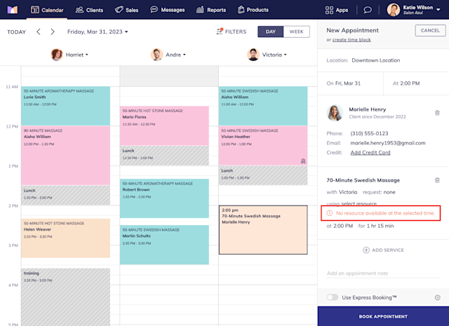 If the resource is unavailable, a message will be displayed in the appointment details indicating the resource is unavailable. In online booking, clients cannot book the service if the resource is unavailable.