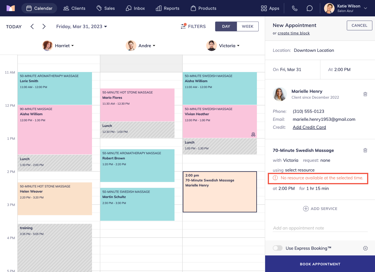 If the resource is unavailable, a message will be displayed in the appointment details indicating the resource is unavailable. In online booking, clients cannot book the service if the resource is unavailable.