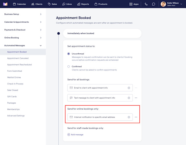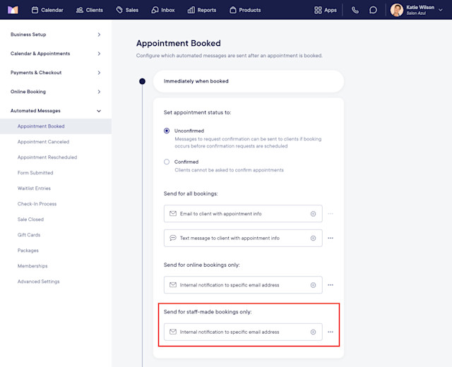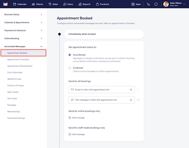 To configure your Appointment Booked automated messages and settings, open the Settings app and select Automated Messages > Appointment Booked.