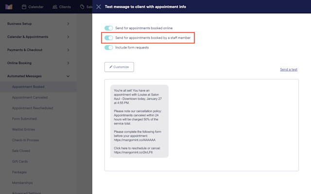 When an appointment is booked, you can send an email and text message to the client with their appointment information.