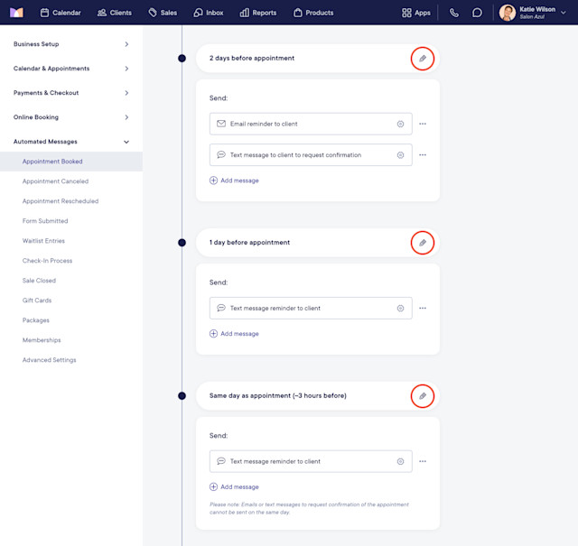 You can set up appointment confirmation requests and appointment reminders to be sent to the client before their appointment.
