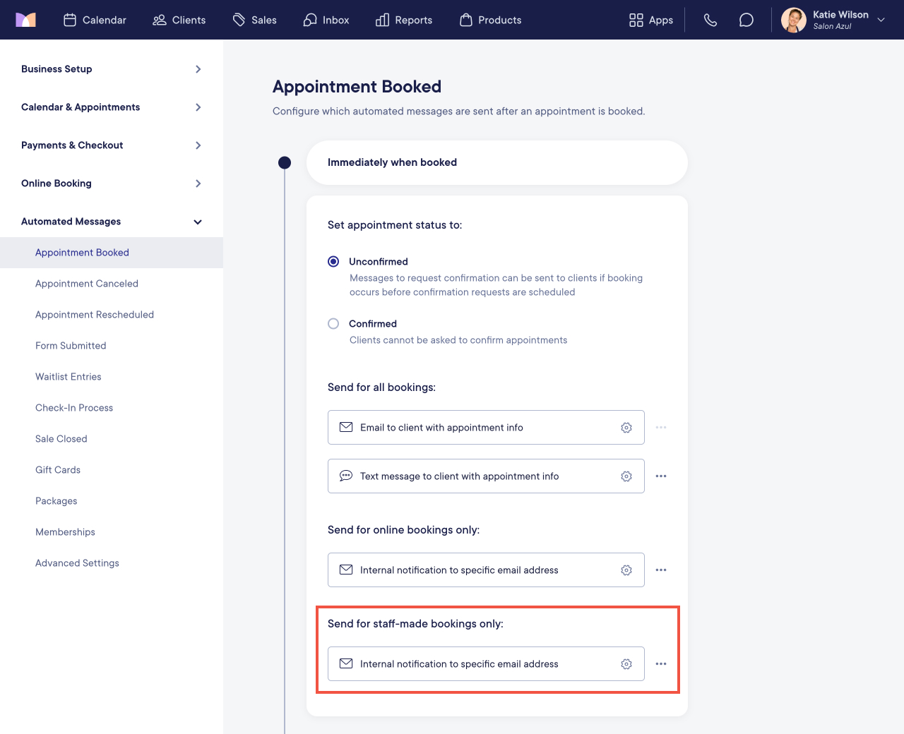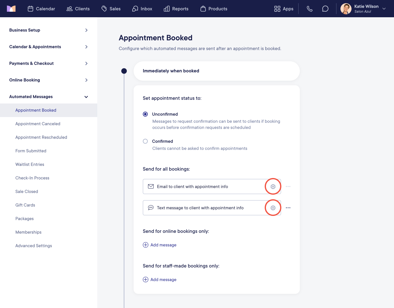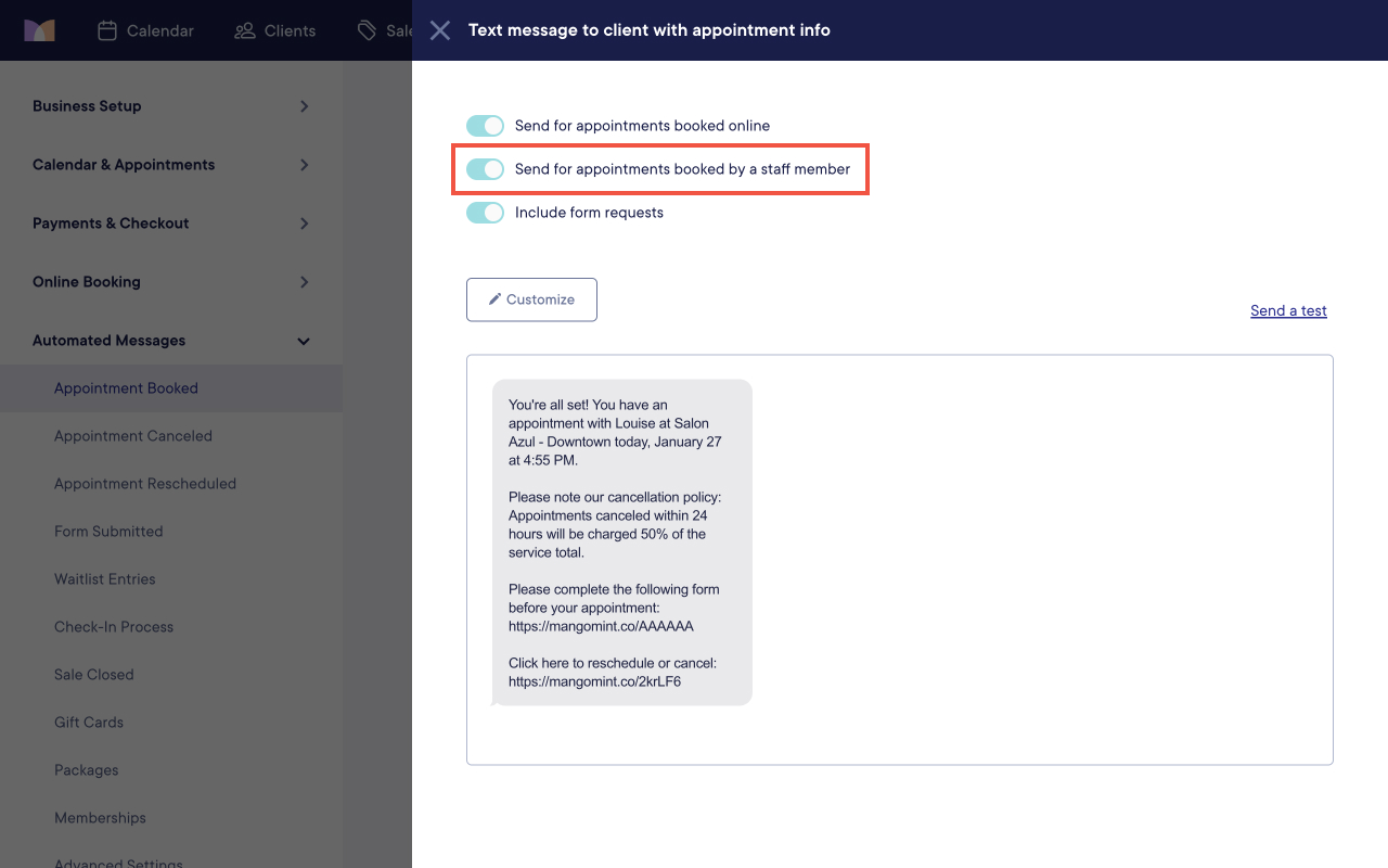 To configure your Appointment Booked automated messages and settings, open the Settings app and select Automated Messages > Appointment Booked.