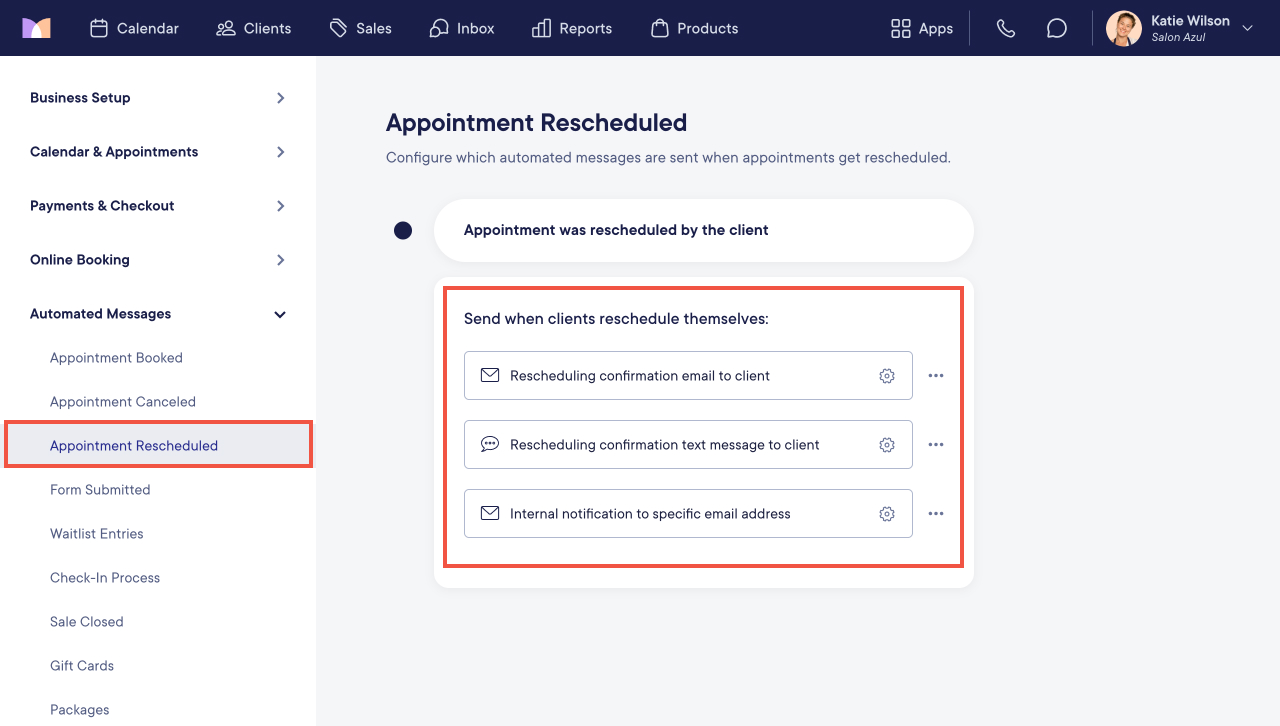 The Appointment Rescheduled automated messages are available if client self-rescheduling is enabled.