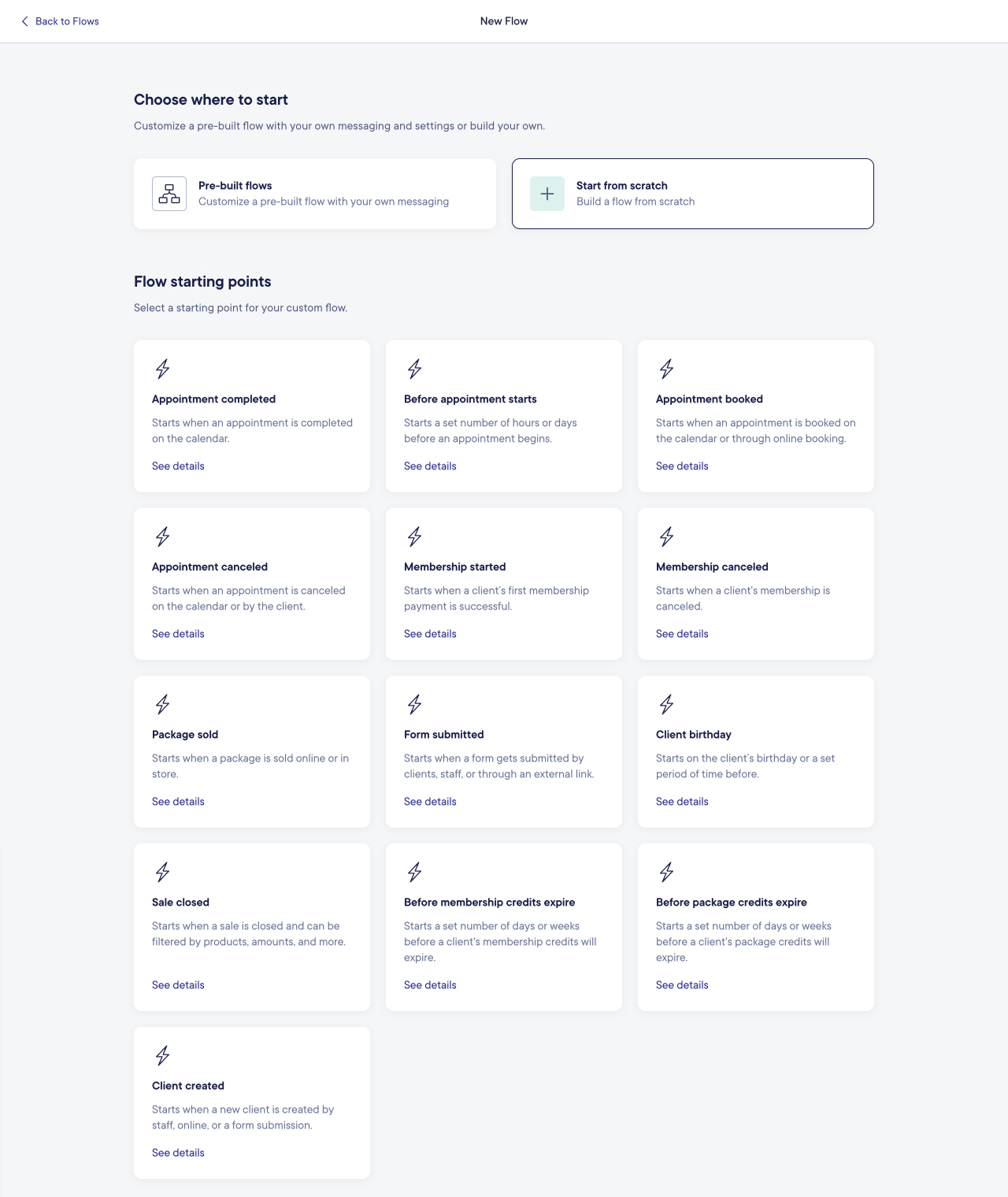 Appointment canceled | The flow will start when an appointment is canceled on the calendar or by the client. Includes appointments canceled due to a no-show. | • Staff member • Service • Service category • Location • Resource • Appointment note • Date • Incomplete forms |