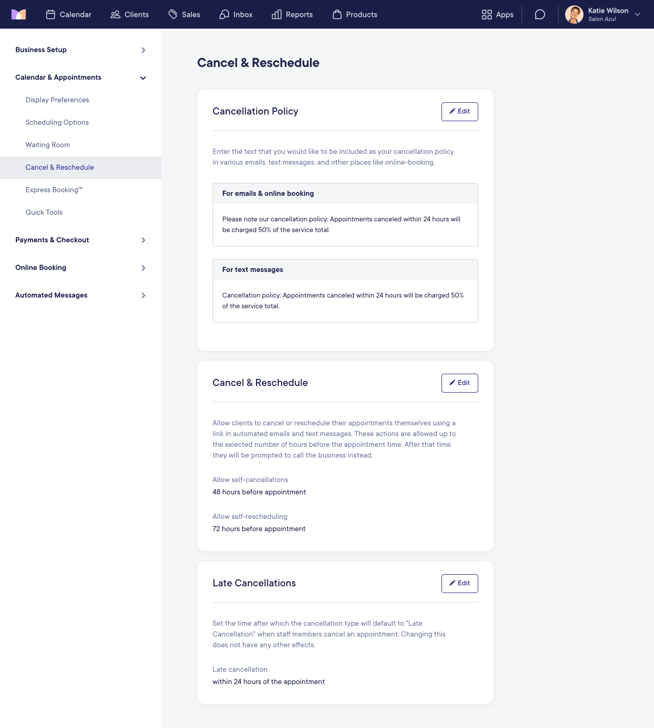 Once you add your cancellation policy, it will be included in various automated emails and text messages, and other locations such as online booking.