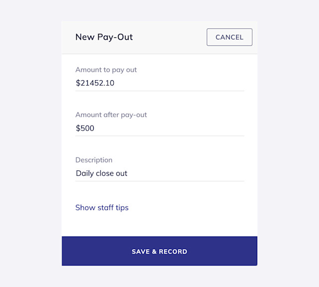 To close out the cash drawer at the end of the day, open the Cash Drawer app and select New Pay-Out.