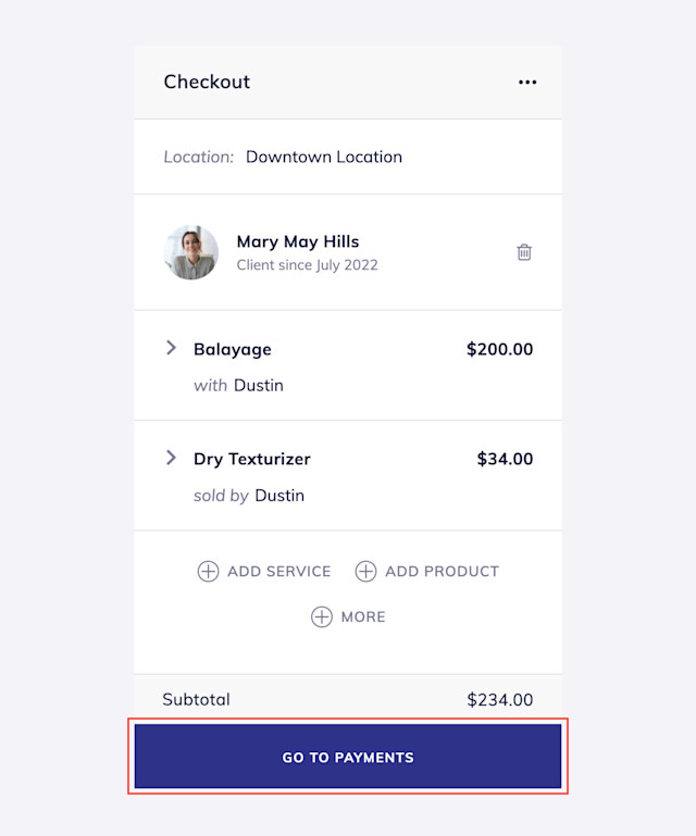 If needed, use the Add Service, Add Product, and More buttons to add services, products, gift cards, or packages to the checkout. Learn how to use a barcode scanner to scan products during checkout.