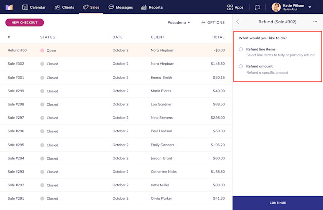 Refund amount: This option allows you to specify an amount that should be refunded without having to choose line items. While this option is helpful if you need to quickly refund the client, the sale will have a remaining balance once the refund is complete. You will need to resolve the remaining balance to ensure you have accurate reports.