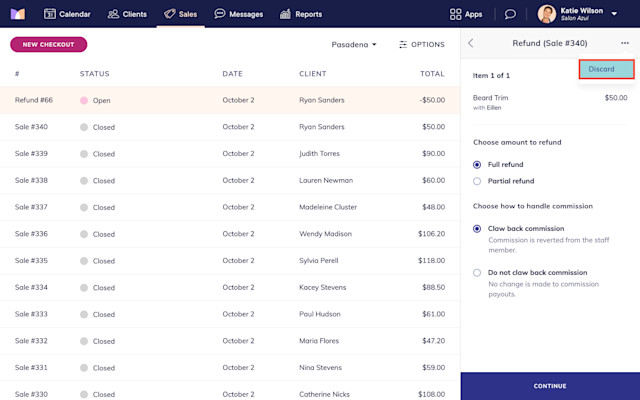 To discard a refund that is in progress, select Discard from the "..." menu. This is helpful if you want to delete the refund and start over. Once a refund is completed, it cannot be discarded.