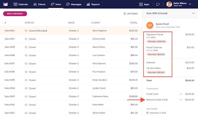 A service, product, and tip are fully refunded. You can also specify whether a line item should only be partially refunded. If you partially refund a service or product and choose to claw back commission, the staff member will only earn commission on the non-refunded amount.