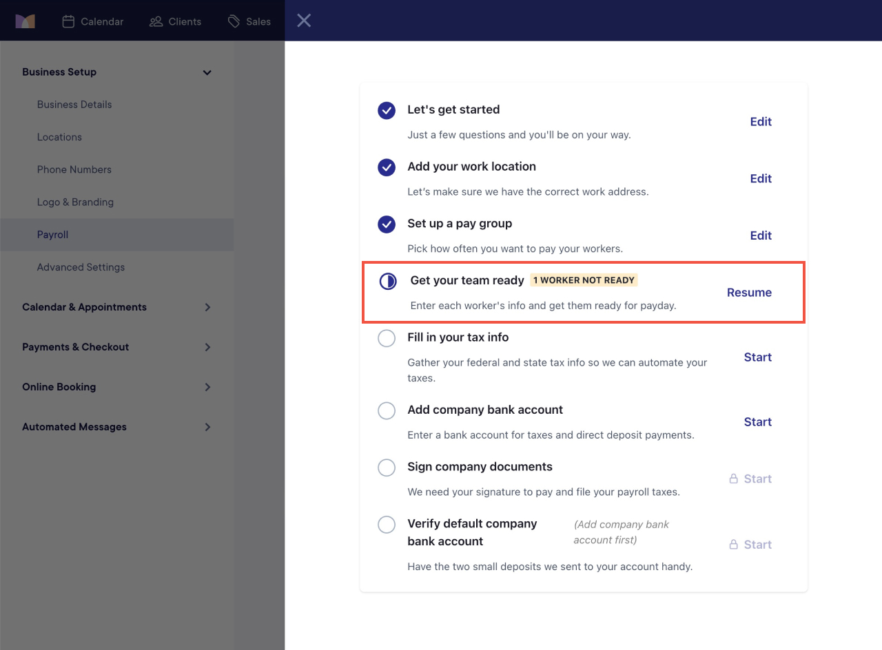 Your first payday is the first date you’d like to begin paying your workers through Mangomint. Keep in mind this date is not final—this date is simply for the Mangomint team so we can help you stay on track and complete your onboarding in time for your first payday.