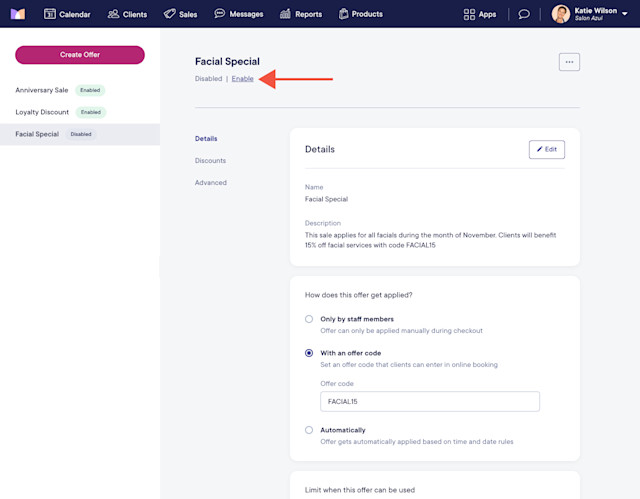 Once you’re finished creating the offer, select Enable to enable the offer.