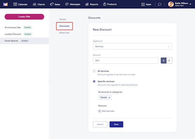 For Service discounts, the discount will be applied to the service price. The service price includes any selected service customizations. You can set the discount to apply to all services, or you can select specific services or service categories. You can also add multiple discounts, such as 30% off all facials and 20% off all massages.