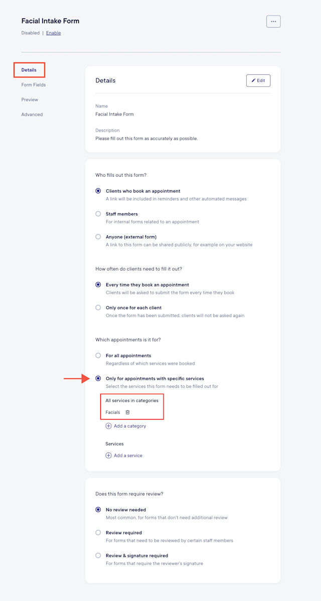 Specify if the form should be submitted for all appointments or only for appointments with specific services. For example, for a client facial intake form, select Only for appointments with specific services and add the entire facials category or specific facial services.