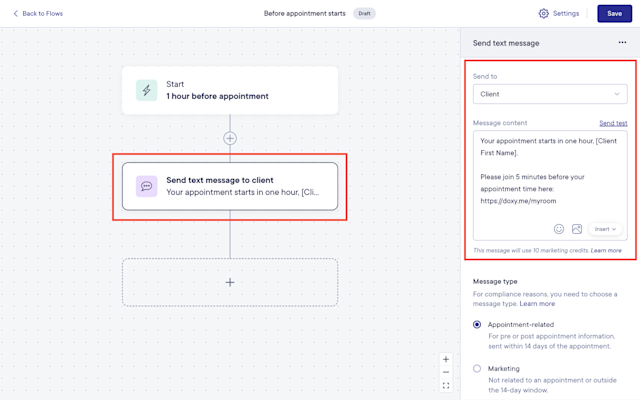 After customizing the trigger, add an email and/or text message to the flow that includes your Doxy room link and any instructions for joining your Doxy room.