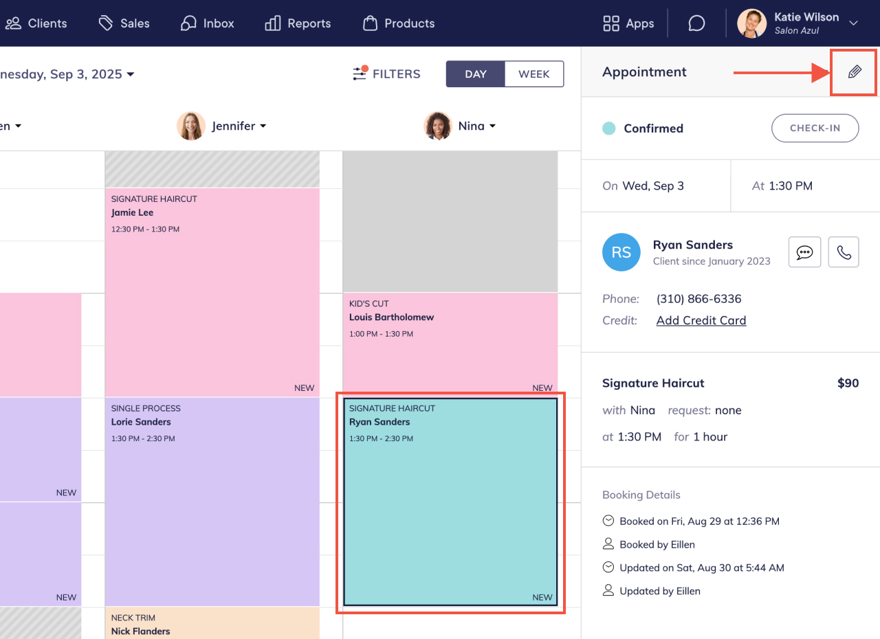 To edit an existing appointment, you can either drag and drop the appointment on the calendar to adjust the date, time, or staff member, or you can select the appointment and select the pencil icon to edit.