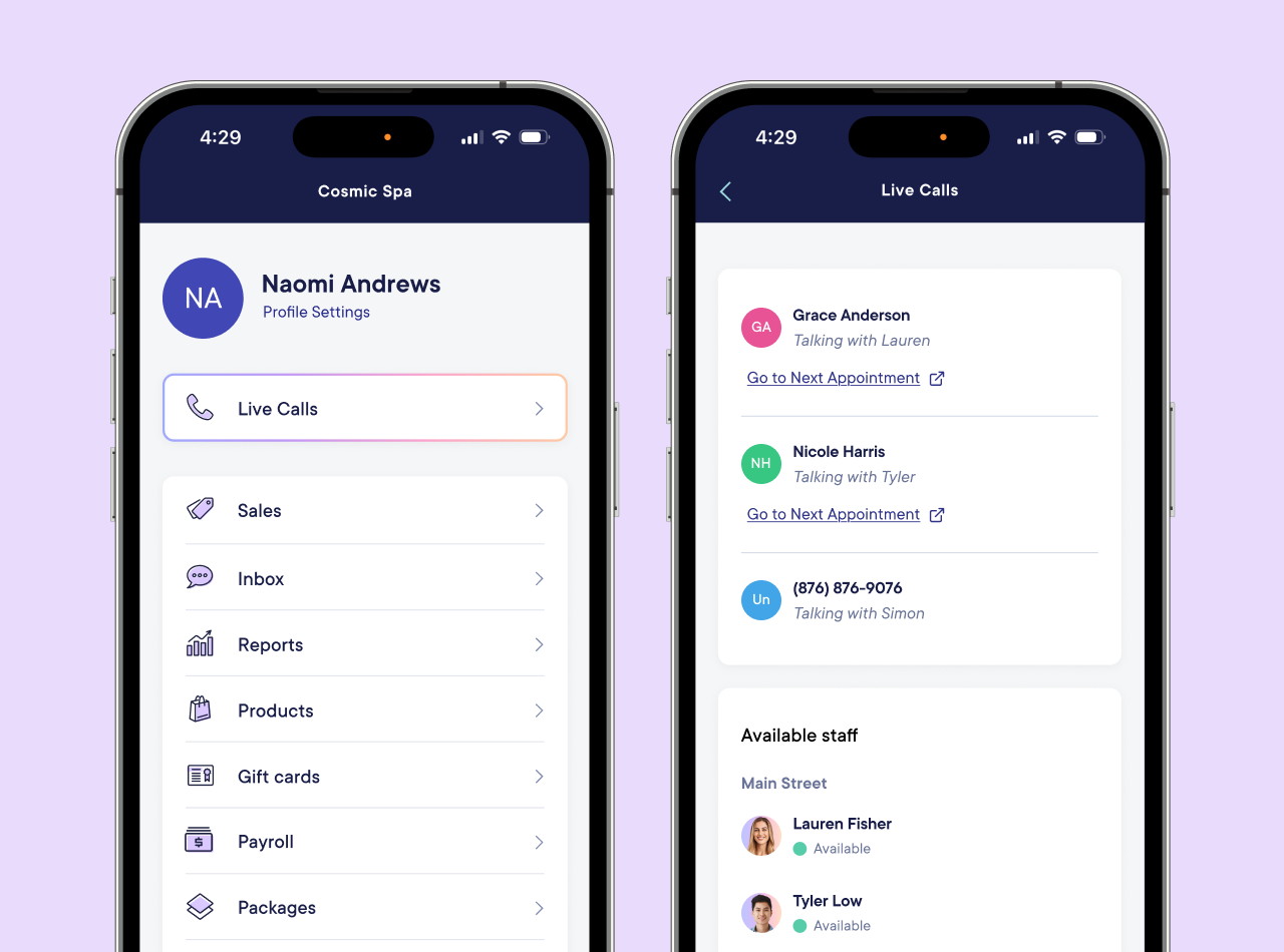 You can view details about live calls and see a list of staff members who are currently available to make and receive calls. Viewing details about live calls can be helpful for front desk staff, as it allows you to quickly find the right client and rebook them or make changes to their upcoming appointment.