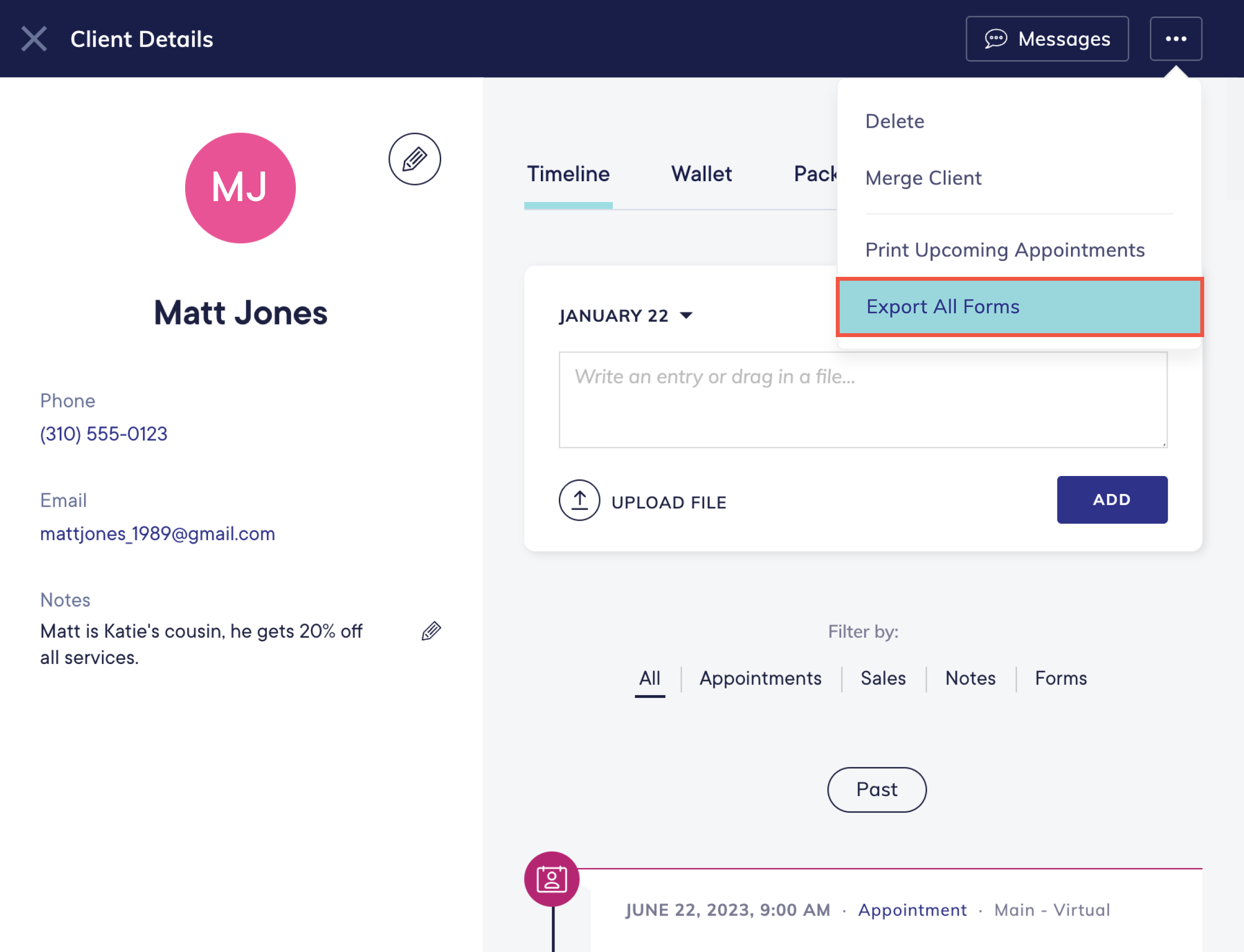 To export a client’s form submissions, open the client details and select Export All Forms from the "..." menu.
