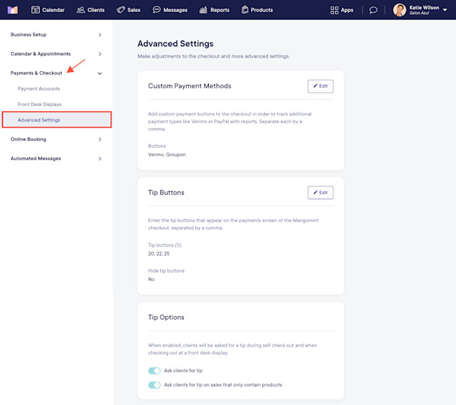 To adjust payment and checkout settings, open the Settings app and select Payments & Checkout > Advanced Settings.