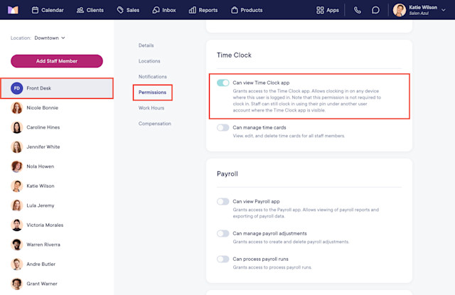 Create a new staff member called Front Desk and enable the Can view Time Clock app permission.