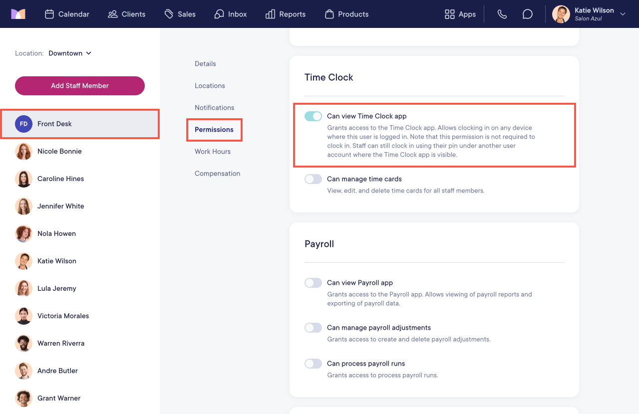 Create a new staff member called Front Desk and enable the Can view Time Clock app permission.