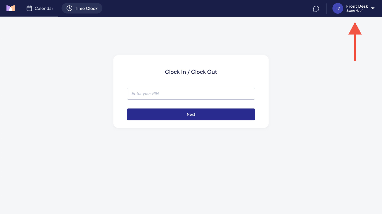 Log in as the Front Desk staff member on the front desk device. Staff members can now enter their time clock PIN on the front desk device to clock in and out.
