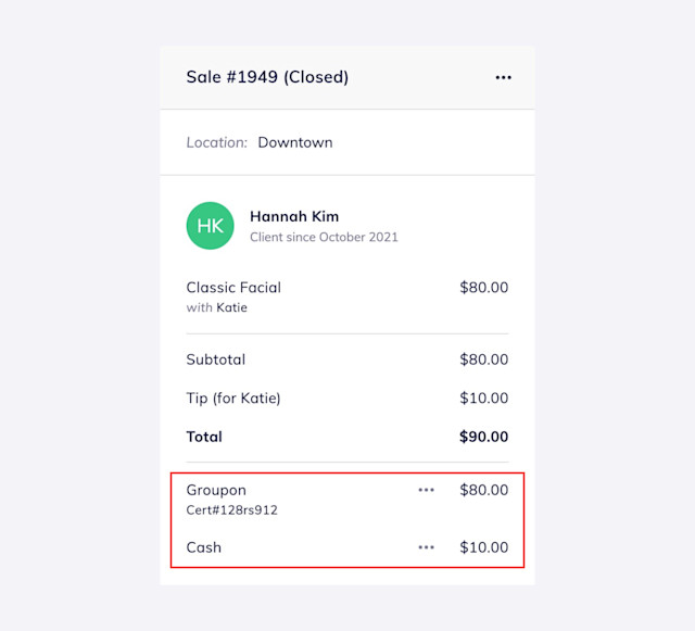 Once the Groupon payment is complete, select another payment method for the remaining balance (tip amount) to complete the sale.