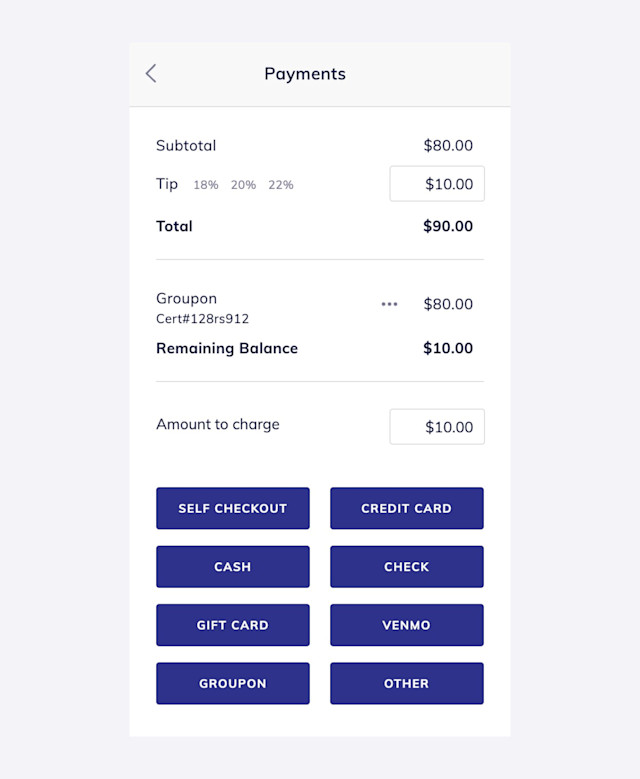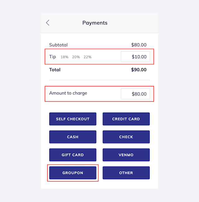 To check out a Groupon service, start the checkout as you normally would. On the Payments screen, ask the client if they would like to leave a tip.
