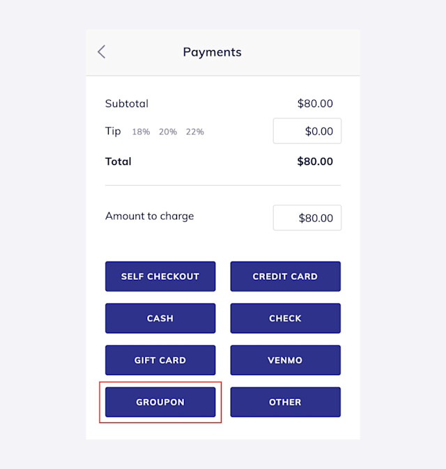 To track your Groupon sales, open the Settings app and go to Payments & Checkout > Advanced Settings > Custom Payment Methods to add a Groupon payment button.