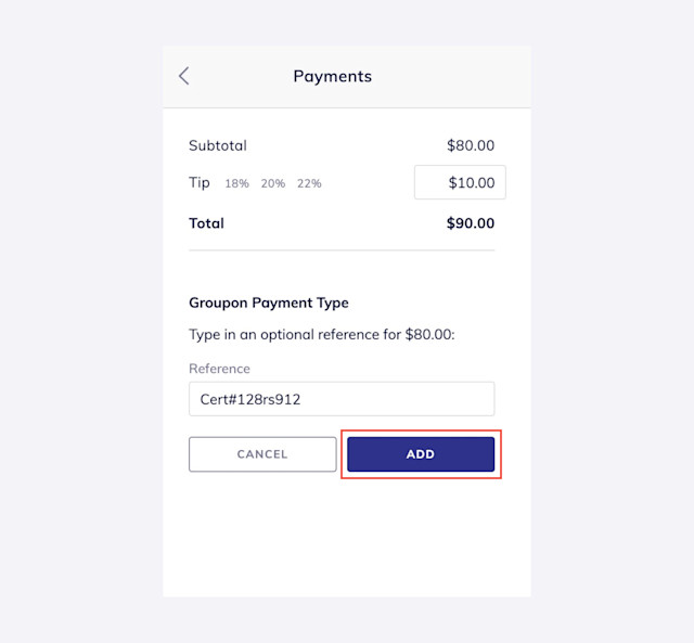 Add any reference notes, if needed. Select Add to complete the Groupon payment.